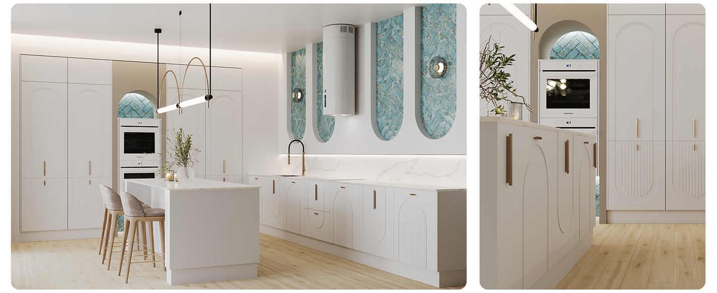 Главная изюминка Арко Эко — арочная фрезеровка фасадов. Она навеяна архитектурой Древнего Рима: торжественные базилики, величественные триумфальные арки, монументальные храмы. Здесь история встречается с современностью — рельеф фасадов не просто украшает, а формирует узнаваемый характер кухни вне времени.