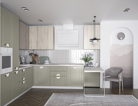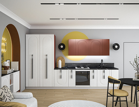 • Арочная фрезеровка фасадов кухни Арко Атриум — не просто декор, а стилистический код, в котором зашифрованы вечная красота и гармония. Её изгибы создают рельеф, в котором играет свет, а тени оживляют поверхность, превращая ее в часть живого пространства. Контрастный терракотовый верх фасадов словно напоминает о закатах над морем, а спокойный матовый низ оттеняет его, создавая баланс и глубину. Кухня становится не только зоной для приготовления еды, но и настоящей архитектурной доминантой интерьера.