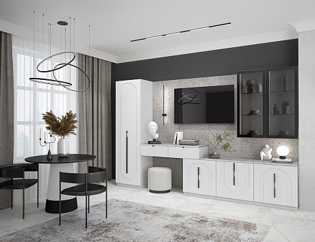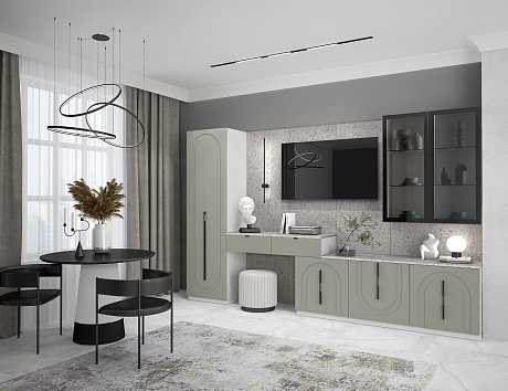 Элегантная геометрия арочной фрезеровки гостиной Арко, благородный кашемировый оттенок фасадов и графичные черные ручки разной длины и на разном уровне привносит в пространство динамику, не давая глазам заскучать. А на стене — декоративная панель с фактурой терраццо, которая подчеркивает строгость и самобытность композиции.
