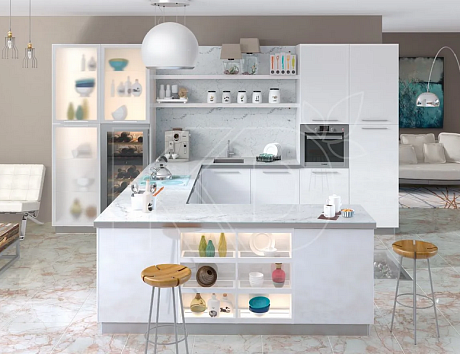 Для просторных кухонь подойдут кухни П-образной формы, модели с островом, полуостровом, практичной барной стойкой. Качественная белая мебель с глянцевыми фасадами прослужит долго, а интерьер при желании можно будет легко преобразить, добавив несколько ярких деталей декора.