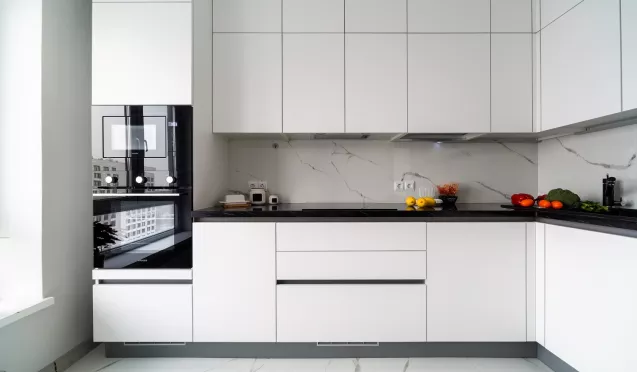 Белый и черный – беспроигрышный вариант для дизайна кухни. Подобное сочетание подойдет для оформления современного интерьера. В небольших пространствах черный цвет можно использовать точечно – в виде фурнитуры, открытых полок или столешницы гарнитура.