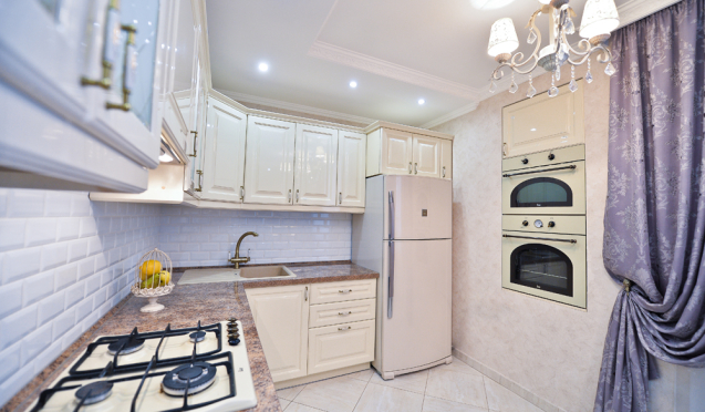 Классическая кухня в бежевых цветах – идеальный вариант для любителей роскоши. Подобные версии отличаются симметричными линиями и четко выверенной геометрией. Для декоративной отделки кухонь в стиле классика используют позолоту, патину, лепнину и резьбу. Выбирая подобную модель, следует учитывать оформление помещения. Например, на окнах должны быть плотные шторы, полы должны быть мраморными или с фактурой натурального дерева.