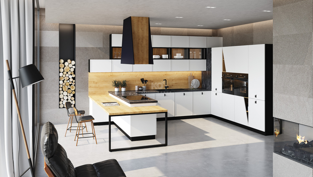 Гарнитур с островом – подходящая модель для квартиры-студии или загородного дома. С помощью такого комплекта можно визуально отделить обеденную зону от гостиной, используя островную конструкцию в качестве стола для приема пищи или дополнительной рабочей поверхности.