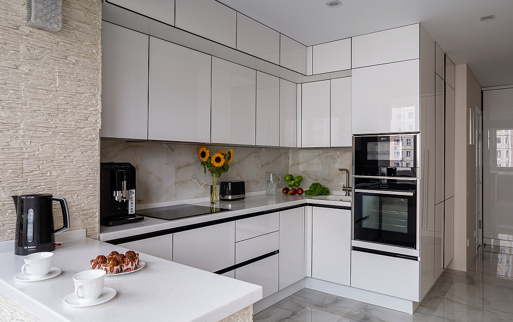 Чтобы П-образная кухня вписалась в интерьер максимально гармонично, расстояние между параллельными сторонами должно составлять, как минимум 120 см. В этом случае не возникнет сложностей при открывании духовки и дверец шкафов.