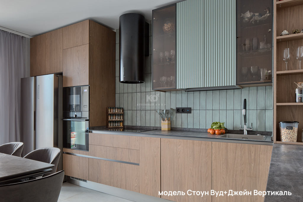 Рифлёные поверхности, бархатистое покрытие Мягкое прикосновение (Soft Touch) и тепло натурального дерева добавляют интерьеру глубины и тактильности. К таким материалам хочется прикасаться — они делают пространство живым, наполненным ощущениями и комфортом. Именно за счёт этих деталей кухня превращается из функциональной зоны в по-настоящему уютное место притяжения для всей семьи.
