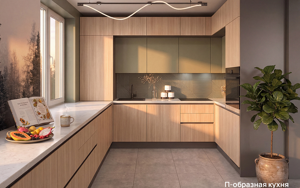 • П-образная компоновка идеально подходит для активной готовки: она обеспечивает максимум рабочей поверхности и вместительное хранение, превращая кухню в организованное пространство, где всё под рукой.