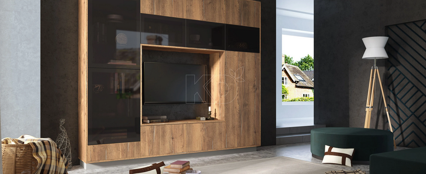 Впрочем, мебель для гостиной не обязательно должна быть изготовлена из натурального массива. Не менее стильным и привлекательным внешне, но гораздо более бюджетным вариантом станет гостиная мебель цвета орех, выполненная из современных материалов: экомассива, экомембраны, экоплит Egger. Такие фасады изготовлены из спрессованных древесных фракций и полностью экологичны: в их состав не входят токсичные и вредные для здоровья компоненты. При этом подобные поверхности полностью идентичны фактуре натуральной древесины как внешне, так и на ощупь, и могут быть выполнены в широкой гамме коричнево-бежевых оттенков.