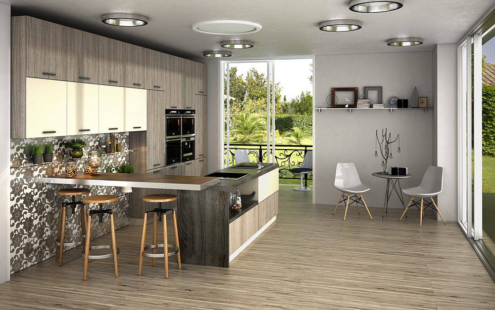 Правильное освещение сделает привлекательной даже самую скромную кухню. С помощью светильников можно выделить открытые полки, рабочую и обеденную зону. Для минималистичного интерьера подойдут лаконичные споты. Пространство в стиле лофт можно обыграть лампами на подвесах. Классический дизайн потребует нарядную люстру.