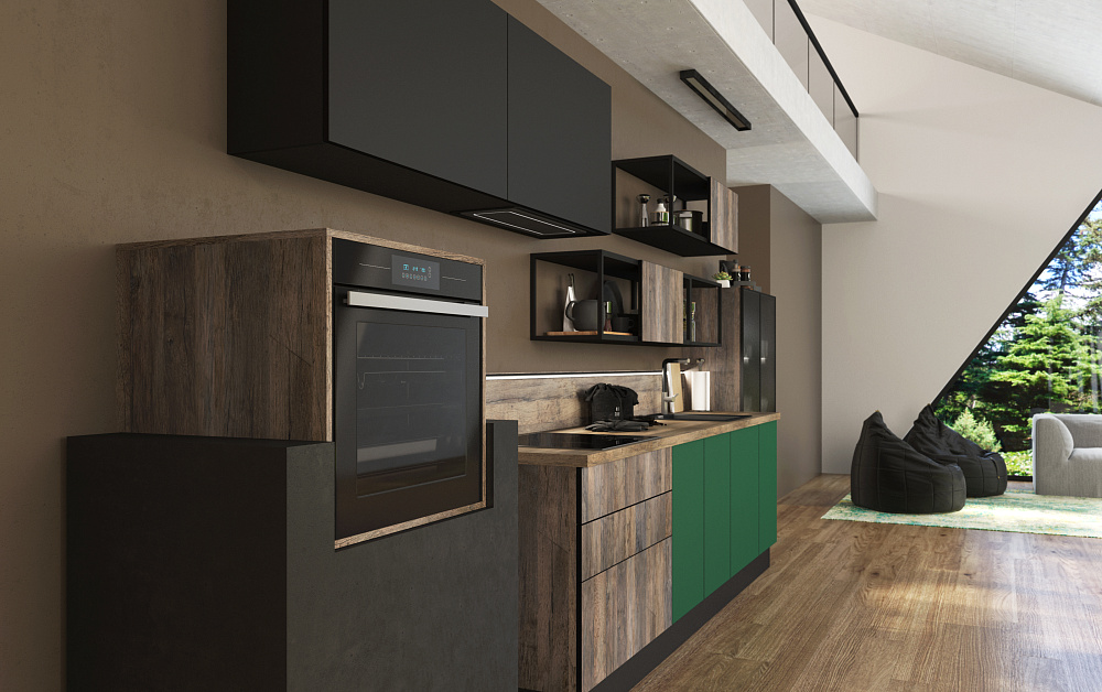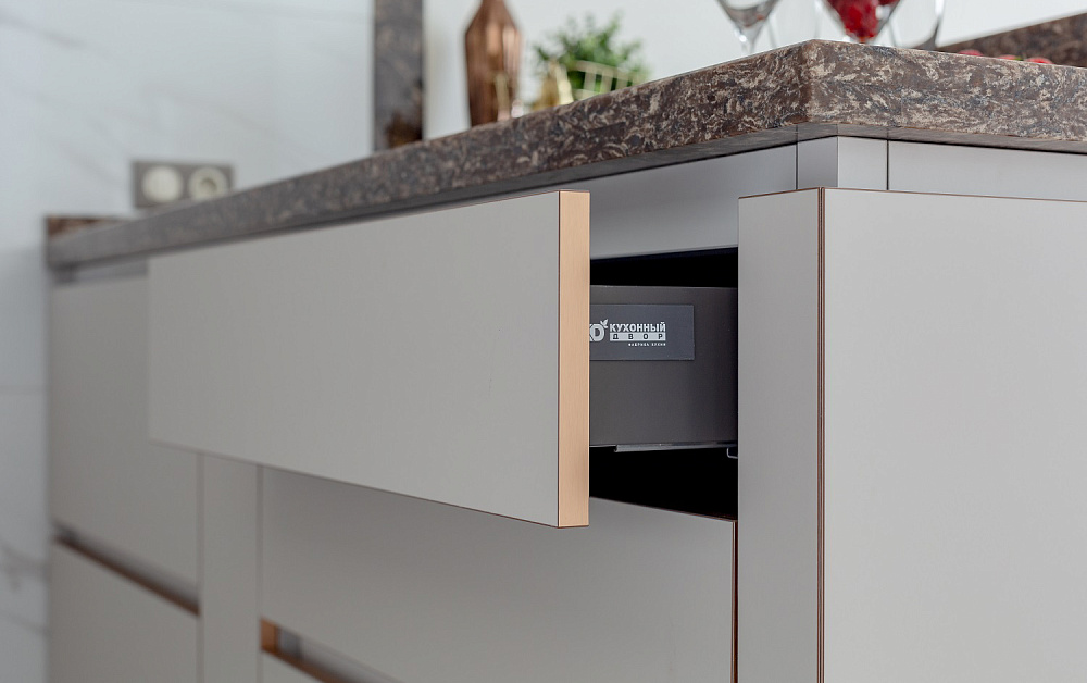 Если вы выбираете изготовление кухни на заказ, внимательно отнеситесь к выбору фурнитуры. Она тоже станет частью пространства, подчеркнет красоту даже недорого ремонта. Для плоских однотонных фасадов можно подобрать эффектные ручки, которые будут смотреться как гармоничный элемент декора.