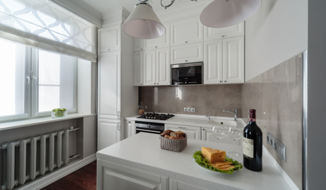 Для помещений большого размера производители предлагают модели с барными стойками. При этом дополнительная конструкция используется в качестве дополнительной рабочей поверхности, на которой можно установить раковину или плиту.