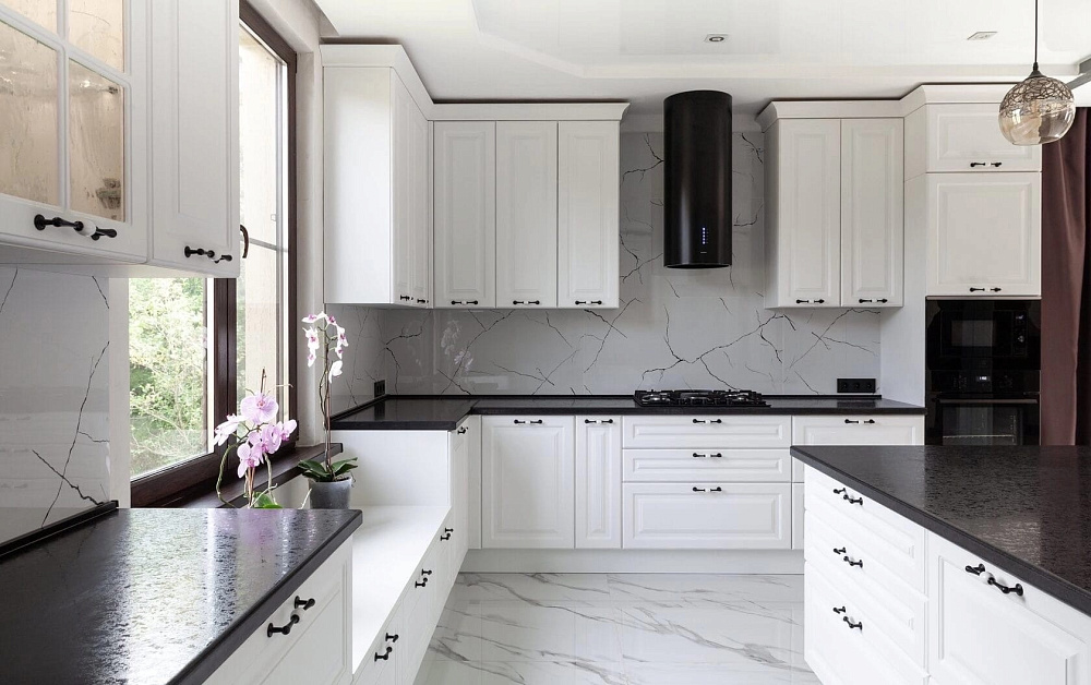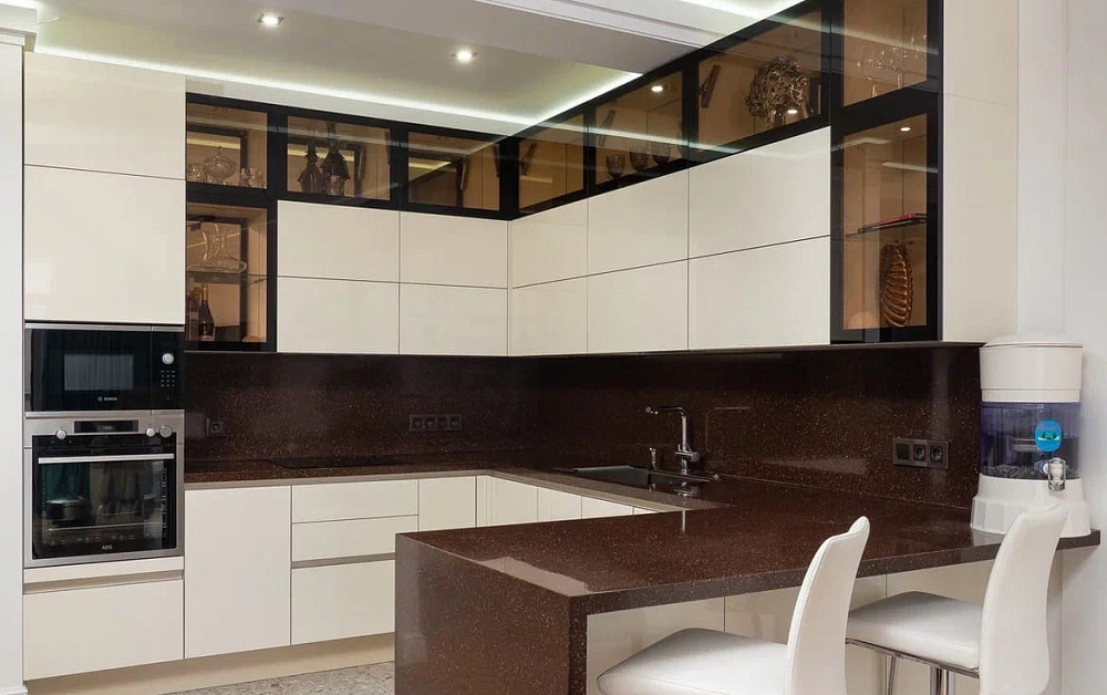 П-образная форма, наоборот, потребует большой площади. Данную конфигурацию обычно выбирают для загородных домов и просторных студий. Шкафы в этом случае устанавливают вдоль трех смежных стен. Преимуществом таких комплектов является вместительность, большое количество рабочих поверхностей и соблюдение правила рабочего треугольника.