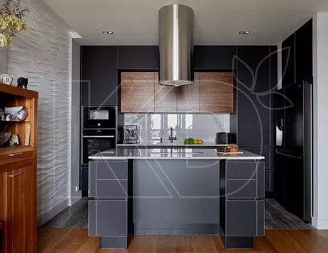 Освежить бежевую мебель поможет черный потолок на кухне. Остальные поверхности могут быть оформлены по-разному. Главное – задействовать светлые оттенки, чтобы уравновесить такое контрастное решение. Стены могут быть бетонными или кирпичными.