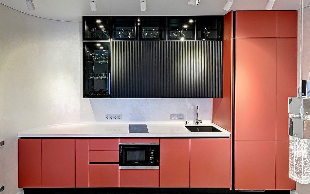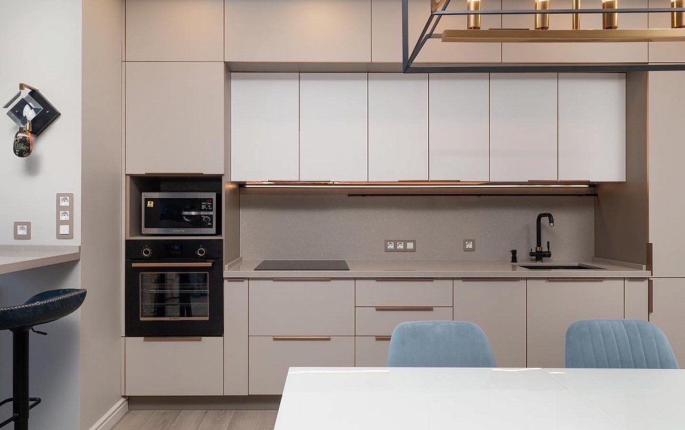 Высокие шкафы-пеналы обычно устанавливают по краям. В них можно спрятать некоторую бытовую технику, а на самые верхние полки убрать предметы, которые используются очень редко.