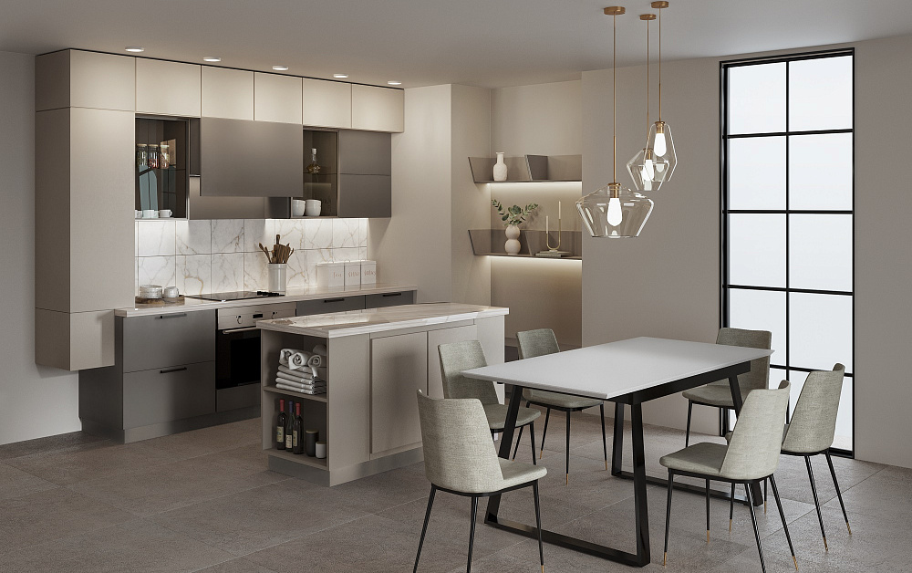 В больших помещениях кухня и гостиная часто оказываются совмещенными. Визуально отделить одну зону от другой можно с помощью островной конструкции, барной стойки или стеллажа. Зонирование с помощью кухни на заказ от производителя технически выполнить гораздо проще. Дело в том, что комплект будет изготовлен с учетом архитектуры пространства.