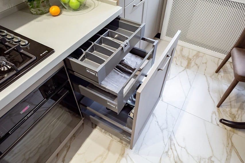 Все кухонные гарнитуры имеют рабочую поверхность, под которой устанавливают места хранения. Специалисты рекомендуют оборудовать нижние модули выдвижными полками, так как они вмещают большое количество предметов и более удобны в использовании. Традиционные ящики лучше оснастить разделителями, что обеспечит комфортное размещение предметов.