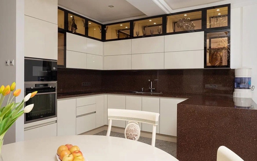 Для комнат с внушительной площадью можно подобрать темную или, наоборот, яркую кухню. В помещениях на южной стороне допускается установка графитовых, шоколадных, вишневых и темно-зеленых комплектов. Более смелый вариант – модель черного цвета.