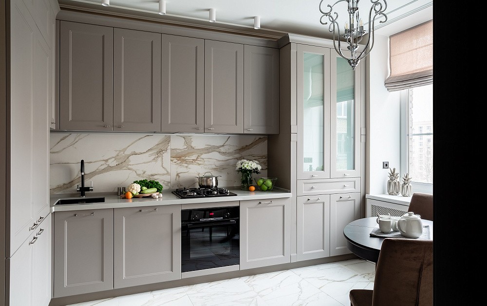 Так, для установки классической кухни потребуется большая площадь. Комплекты в стиле классика отличаются роскошной отделкой в виде позолоты, резьбы, лепнины, патины. Исходя из этого, для оформления стен и потолка следует использовать соответствующие элементы – многоярусные люстры, картины в резных рамах, дорогие обои с теснением и шелкографией. Напольное покрытие может быть каменным, деревянным или из искусственных материалов высокого качества.