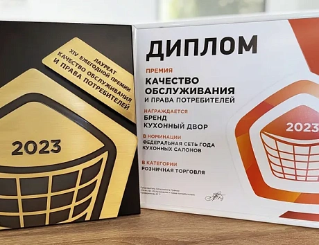 Компания Кухонный Двор по праву заслуживает звание качественного производителя и является обладателем многочисленных наград как российских (в том числе отраслевых), так и международных. В числе наград бренда – неоднократно полученная престижная премия «Качество обслуживания и права потребителей».