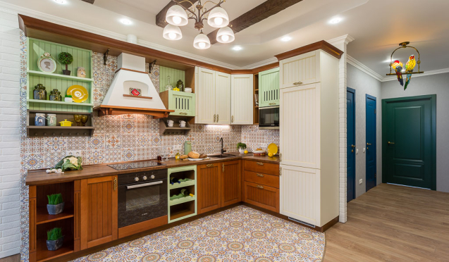 Создать уютный интерьер позволяют кухни кантри со светло-коричневыми и бежевыми фасадами. Помещения с подобными комплектами лучше обыграть соответствующими элементами – текстильными ковриками, ситцевыми занавесками и глиняной посудой.