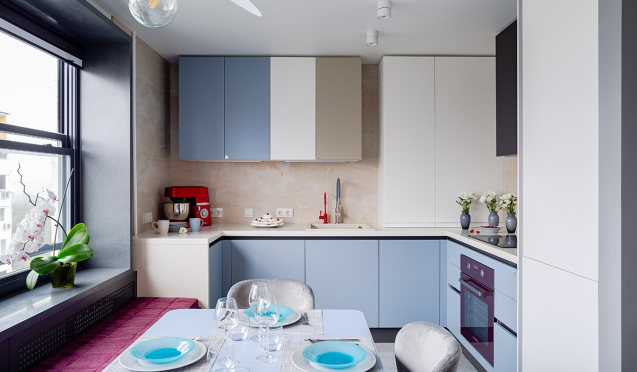 Г-образную планировку кухни смело можно назвать умной. При подобном расположении модулей с пользой задействуется свободный угол. В него, как правило, встраивают мойку, дополнительный отсек или полку.
