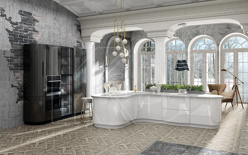 Белый гарнитур может иметь любую планировку, поэтому нужный вариант найдется для любой площади. Для большой комнаты или квартиры-студии подойдет островная модель. С ее помощью можно зонировать пространство. Конструкция в виде острова, совмещает в себе столешницу с варочной панелью и мойкой, иногда и с дополнительными ящиками.