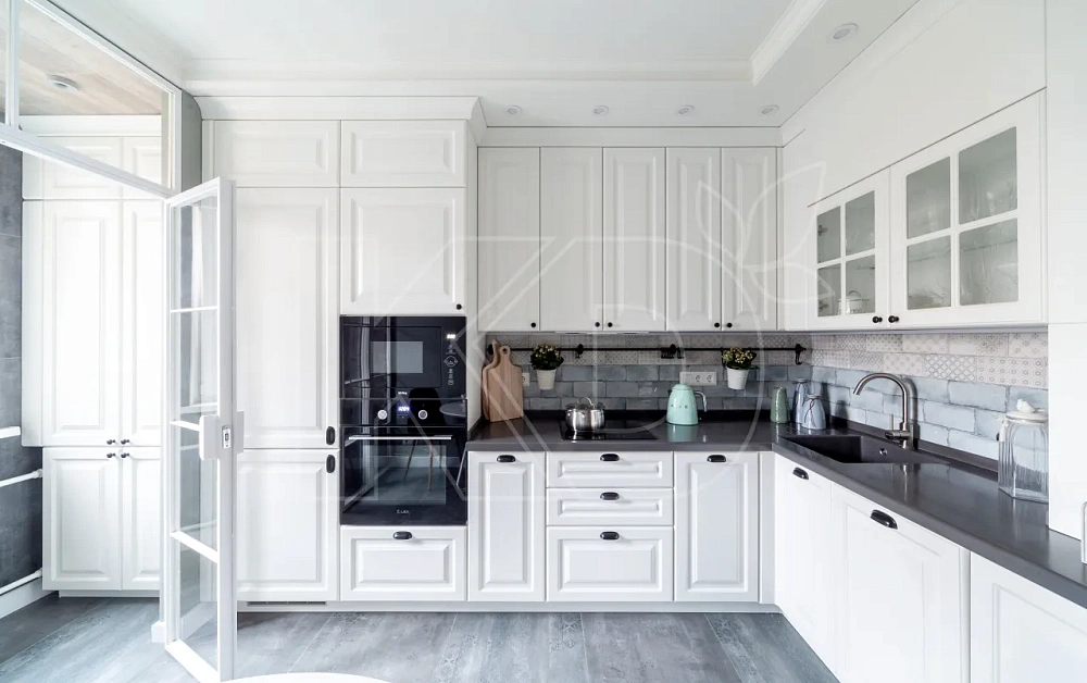 В средних по размеру помещениях часто устанавливают угловые кухни. В белом цвете они выглядят особенно эффектно, потому что не перегружают комнату. При такой планировке в свободный угол обычно встраивают шкаф для посуды и мойку.
