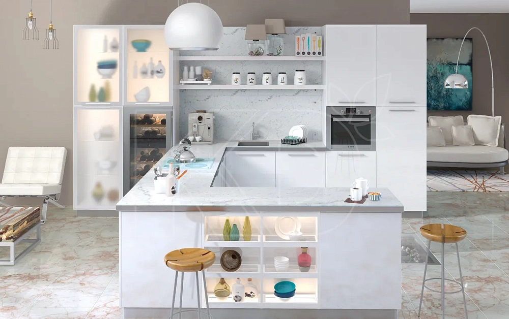 На этапе проектирования определяется не только форма мебели, но и то, чем будет укомплектован кухонный гарнитур. Количество выдвижных ящиков, открытых и закрытых полок выбирается с учетом размеров комнаты и уровня ее освещения.