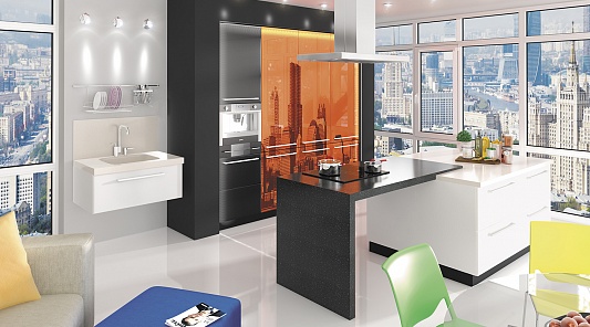 Использование контрастных элементов в интерьере – достаточно распространенный дизайнерский прием. Он позволяет сделать интерьер оригинальным, интересным и ярким. Гарнитуры с фотопринтами обычно изготавливаются из МДФ. Это прочный и надежный современный материал. Дизайнеры любят его за возможность экспериментировать с видами декоративной отделки.