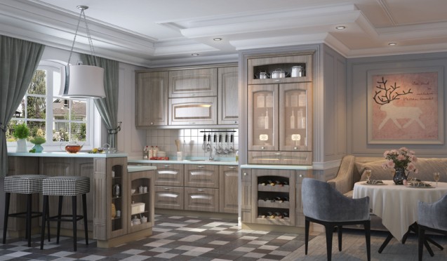 В неоклассике красота стоит на втором месте после комфорта. Дизайнеры делают ставку на тщательно спланированное зонирование. И только после этого подбираются материалы, техника, фурнитура, форма и цвет гарнитура. Чем больше свободного пространства будет в кухонном помещении, тем практичнее его можно обустроить согласно собственным представлениям.