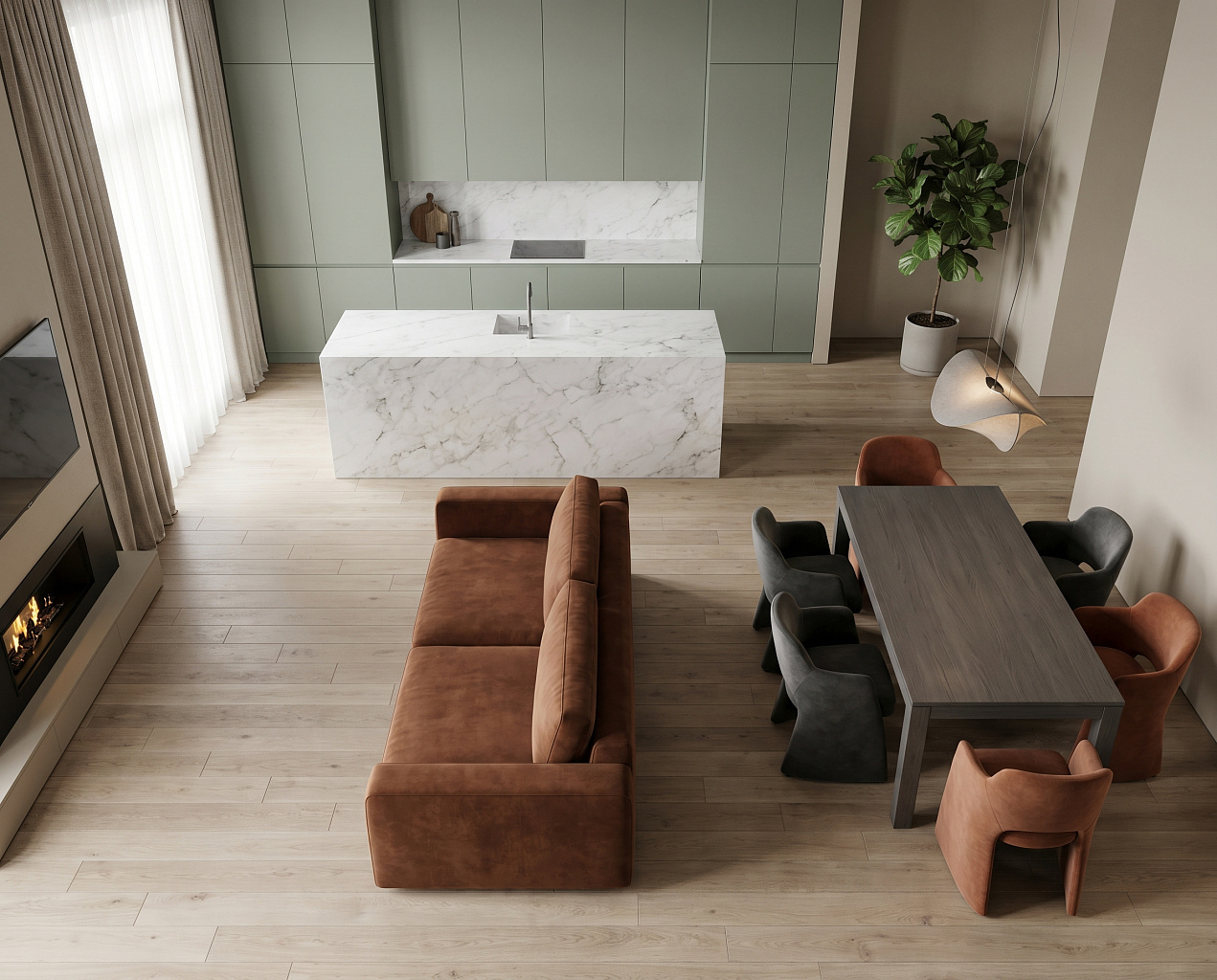 В больших квартирах часто объединяют кухню с обеденной или гостиной зоной, чтобы пространство выглядело свободнее и светлее. Диван, мягкие кресла или полноценная столовая группа помогают создать уютный уголок для отдыха, семейных ужинов и общения с друзьями, превращая кухню в настоящее сердце дома.