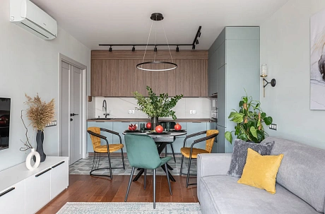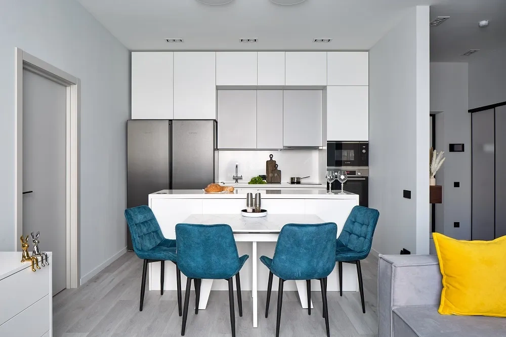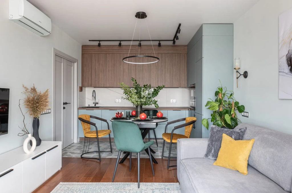 • Комната становится визуально просторнее. Даже небольшие квартиры кажутся больше и воздушнее, когда кухня и гостиная объединены.