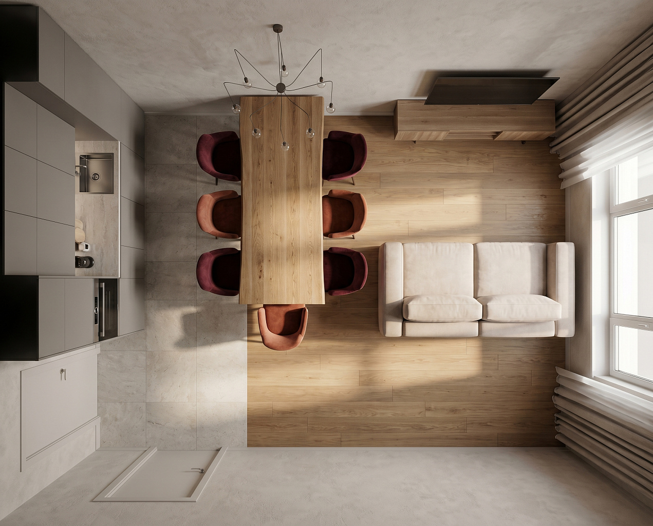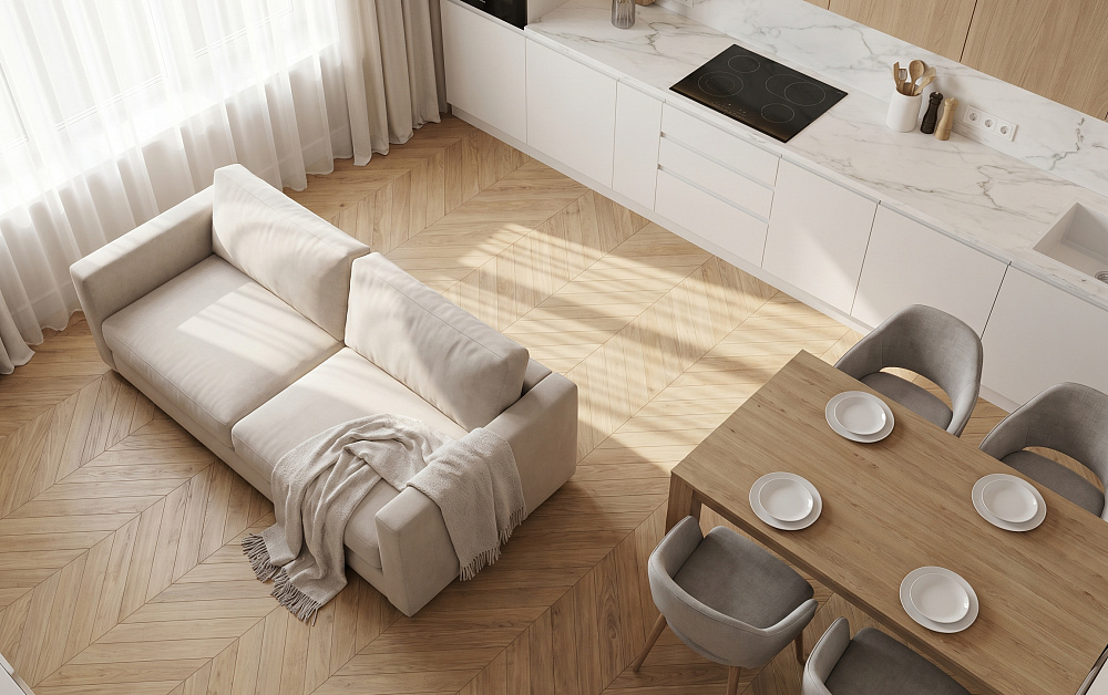 • Разные покрытия для кухни и гостиной (плитка + паркет).