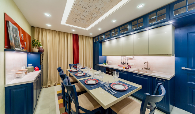 Расширить маленькую кухню можно посредством объединения с гостиной. В этом случае это может быть желтая кухня или синяя кухня.