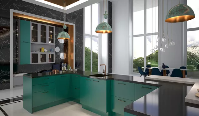 Подобрать зеленый комплект можно для любого помещения. Главное – учитывать, в каком стиле выполнена мебель для кухни. Если вы выбираете вариант для пространства с высокими потолками и большими окнами, обратите внимание на классические гарнитуры.
