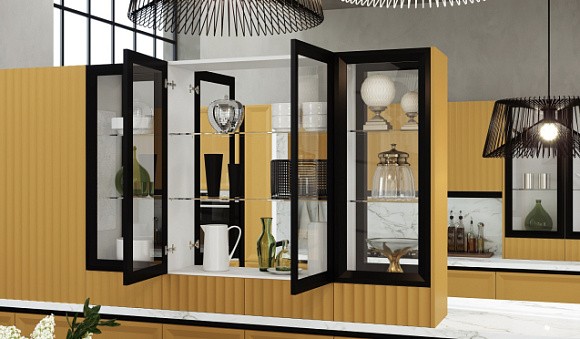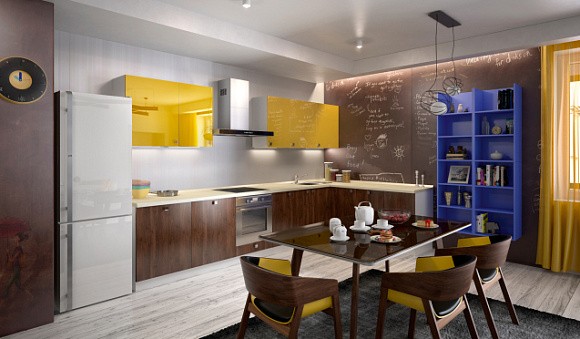 С черным. Подобная комбинация используется обычно в больших помещениях. Кухонный гарнитур желтого цвета можно обыграть черными деталями – полками, вставками, столешницей и фартуком.