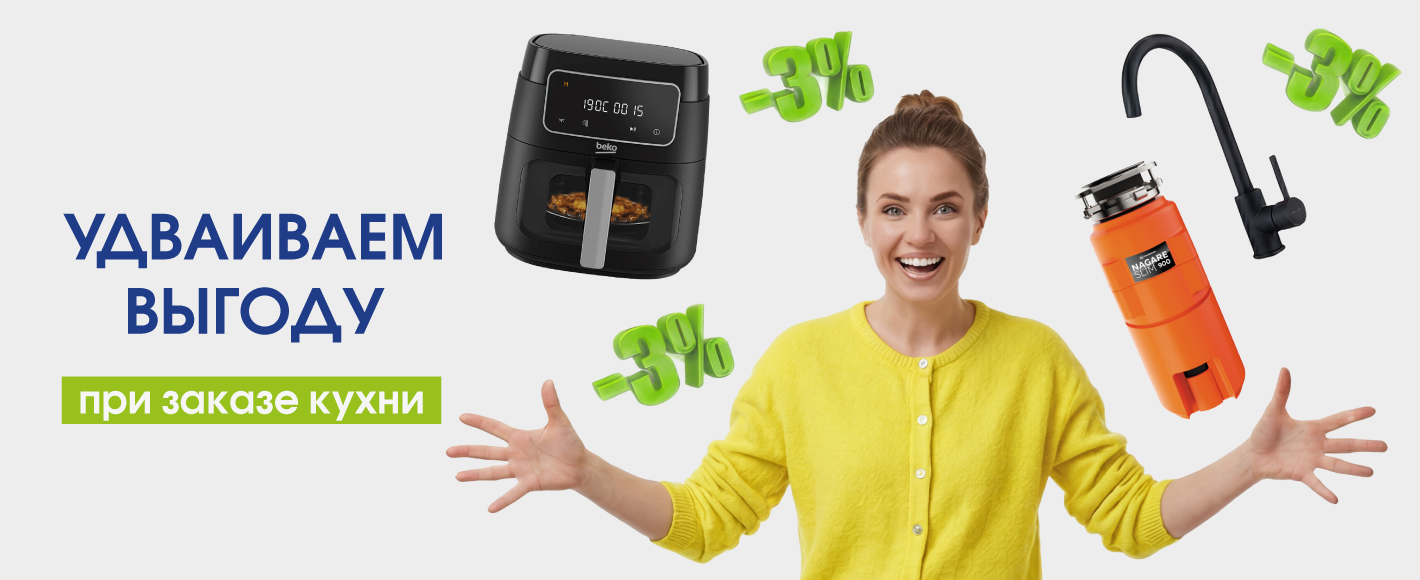 • Дополнительная скидка 3% на всю кухонную мебель — приятный бонус для вашего бюджета.